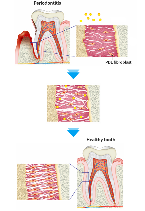 · The ultimate aim of periodontal treatment is to regenerate periodontium damaged by periodontal diseases, more specifically to restore the function of periodontium via regeneration of the periodontal ligament between the cementum damaged by inflammation and the alveolar bone, and enhanced attachment of the periodontal ligaments to the surrounding components.